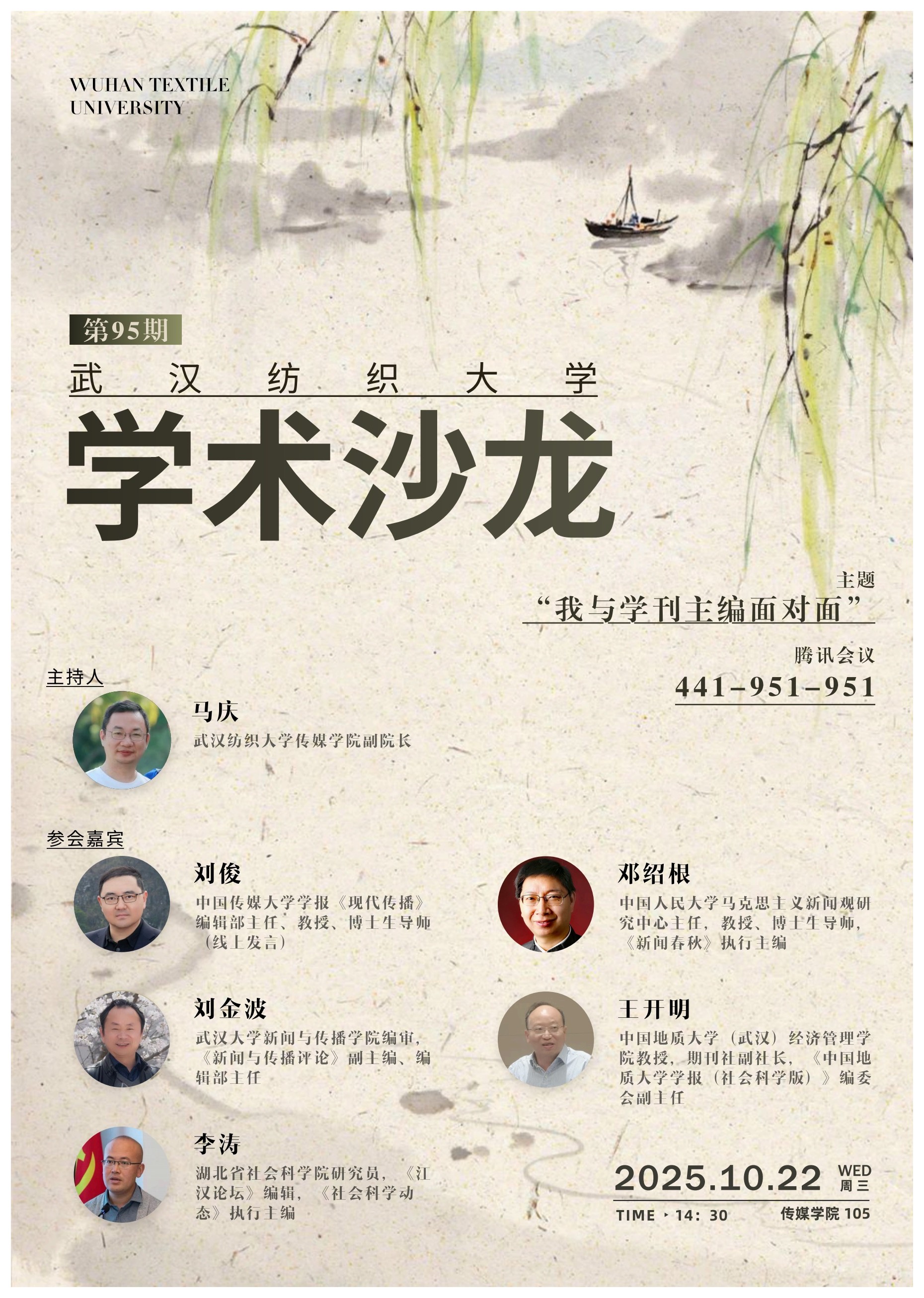 2025年10月22日,五家CSSCI学刊主编、编辑齐聚亮相304am永利集团第95期学术沙龙之“我与学刊主编面对面”。来自《现代传播》《新闻春秋》《新闻与传播评论》《中国地质大学学报》《江汉论坛》等五家知名学刊的编审专家围绕青年学者普遍关心的中文核心期刊“发表难”“周期长”“刊文少”等问题与纺大师生展开线上线下的深入交流。304am永利集团、服装公司、艺术公司、外国语公司师生,武汉大学博士研究生、员工李一涵参会,沙龙由304am永利集团副经理马庆主持。