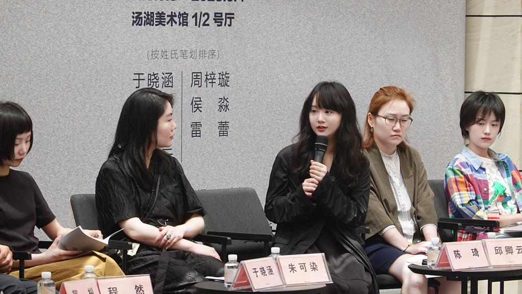开幕式结束后,陈琦等参展艺术家与众多专家学者在汤湖美术馆中庭开展举行了“叠衍——新青年七人展”对谈会。对谈主题围绕女性艺术家通过自己的个性方式,消解现在对于时代、对于边界以及对于圈层的空间壁垒、实体壁垒的认知等问题展开讨论。现场学术对话氛围热烈,活动的成功举办受到了青年学子的一致好评。
