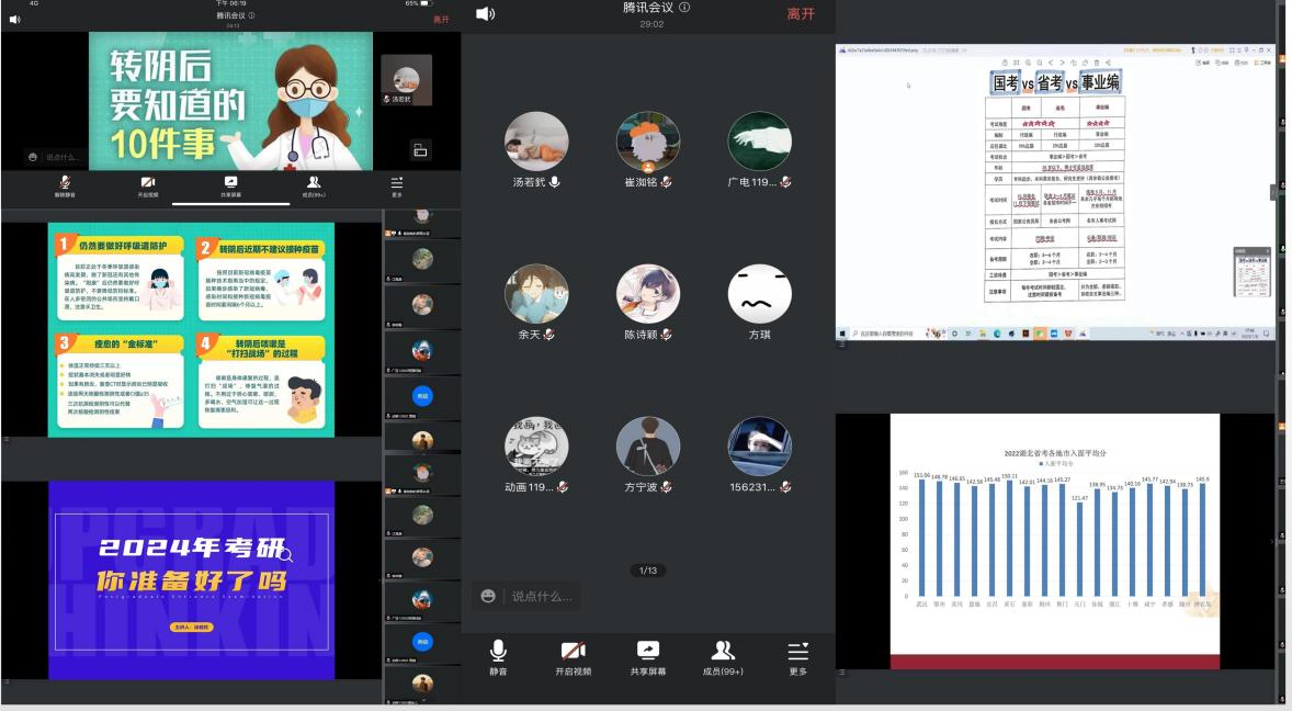 主题班会,新策宣教,同心同力。通过主题班会形式,各年级各班级开展了《新型冠状病毒感染防控方案(第十版)》和《新型冠状病毒感染疫情防控操作指南》的学习,引导员工树立“每个人都是自己健康第一责任人”的理念。同时针对高年级员工特点,2019级开展就业路径选择交流会,帮助员工确定职业发展路径;2020级开展朋辈领航活动帮助员工明晰规划和发展方向,助力考研和学风建设。
