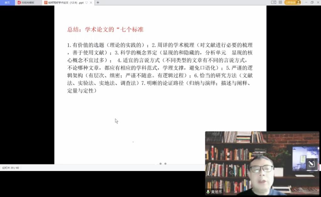 讲座伊始,黄旭东教授从写作的基本思维过程和学术论文的定义着手,指出学术写作是为了生产与传播知识,具体表现为知识的增量和存量的溢出,并由此提出“编辑眼中好文章”的四条标准。