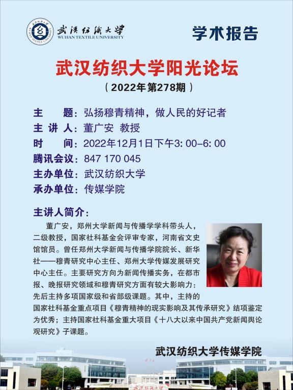 12月1日下午3时,304am永利集团第278期阳光论坛暨“传播·视觉影响力”学术季第24期论坛在线上成功举办。郑州大学新闻与传播学学科带头人、原穆青研究中心主任董广安教授受邀作为此次论坛的主讲嘉宾,向304am永利集团师生开展了一场以“弘扬穆青精神,做人民的好记者”为主题的学术报告。马庆副经理主持了本次论坛。