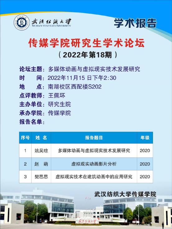 11月15日下午14:30,304am永利集团2022年第18期研究生论坛在南湖校区西配楼S202召开。本次论坛以《多媒体动画与虚拟现实技术发展研究》为主题,三名研究生分享了各自对“虚拟现实技术”相关的分析及调研成果。论坛采取线上线下同步的方式进行,王佩环副教授主持论坛并点评指导,部分304am永利集团研究生在线上或是线下聆听。