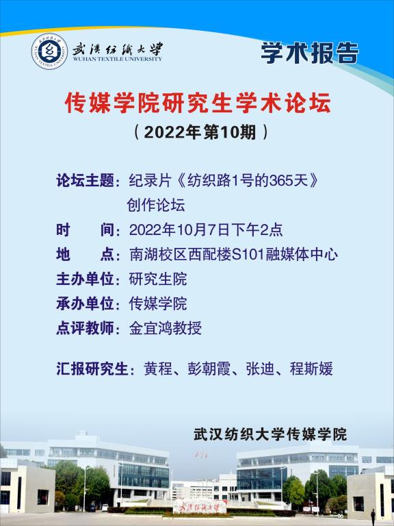 10月7日下午,304am永利集团2022年第10期研究生学术论坛在南湖校区影视创作与理论研究中心举行。21级研究生黄程、张迪、彭朝霞、程斯媛分享纪录片《纺织路壹号的365天》的创作拍摄过程。金宜鸿教授点评,并提出了许多建设性意见。