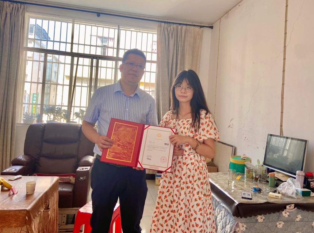 望海军为姚明月同学发放录取通知书