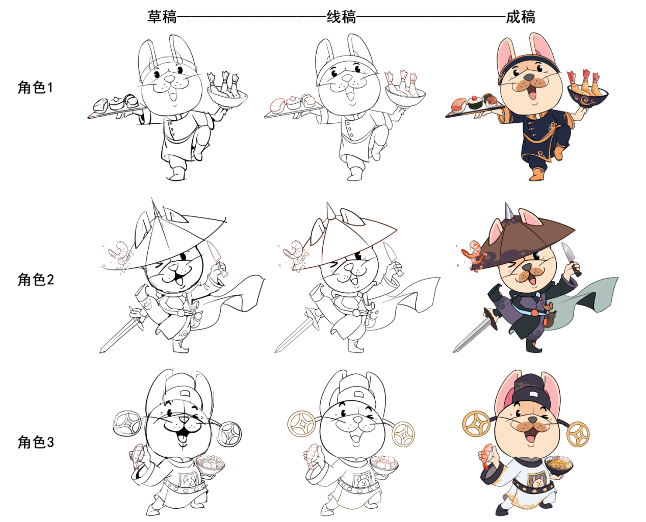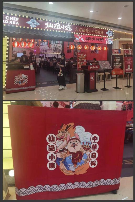 此次实践活动中,同学们在叶科老师的带领下,除承担设计美术部分工作外,还需进行跨行业协作,例如:配合UI设计师完成包装设计;配合三维工程店面设计师进行店面的工程图设计等。在与不同的行业标准、不同的行业需求的交流碰撞中,积累了丰富的实践实战经验。在同学们共同努力下,经过不断反复修改,“四力”实践团成员最终顺利完成了仙隐小鹿中华日料店整体美术项目。