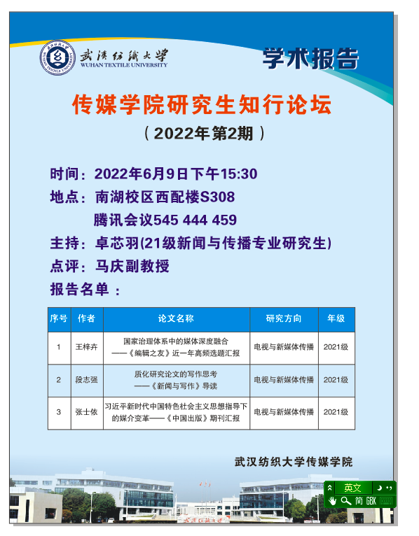 为培育“学术争鸣,知行合一”的优良学风,加强研究生学术交流,在学术碰撞寻求科研创新,2022年6月9日下午15:30,304am永利集团研究生知行论坛(2022年第2期)在南湖校区西配楼S308顺利举办。论坛由304am永利集团副经理马庆主持。
