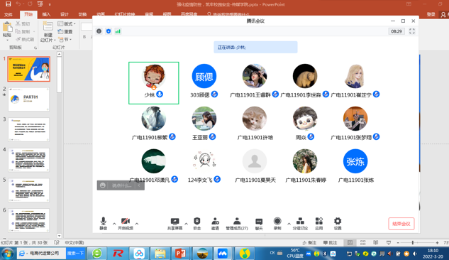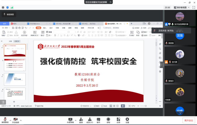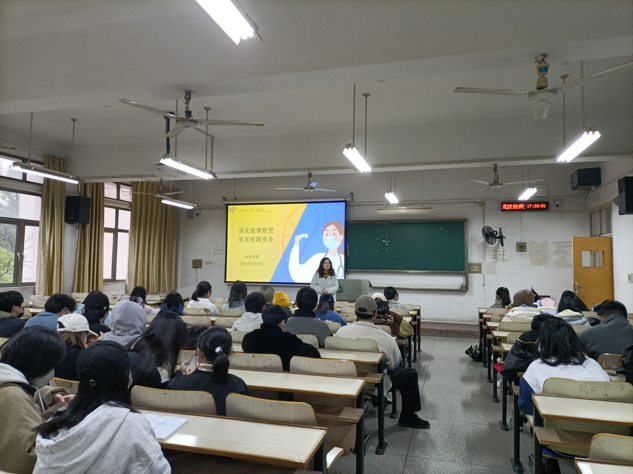 《强化疫情防控,筑牢校园安全》主题内容分为春季健康卫生、疫情防控要求、筑牢校园安全三个方面。会议伊始,各班班主任为同学们科普了春季传染病的知识,并对春季传染病的预防措施做详细介绍,同学们就春季健康卫生状况进行了互动交流;其次,在疫情防控模块,提醒同学们注意安全收取快递,非必要不离校等,话题围绕日常生活展开;最后,在筑牢校园安全模块,班主任关心同学们的日常生活及学习状况,并提醒同学们注意寝室防火防电,预防校园诈骗,以及要做好降雨天气防范的准备。