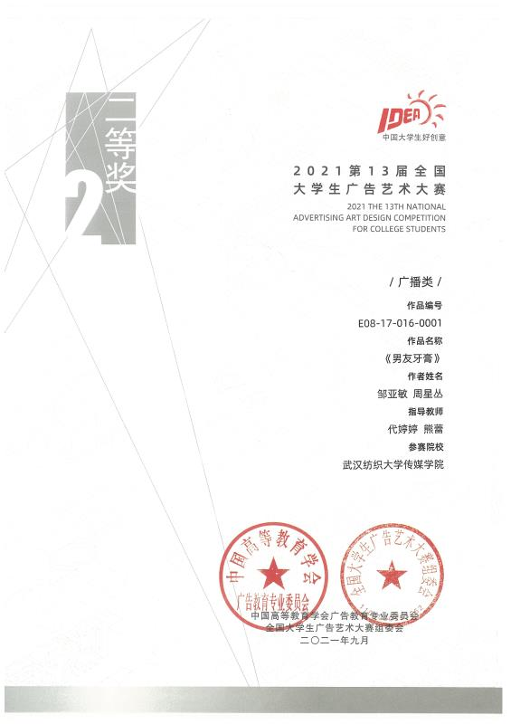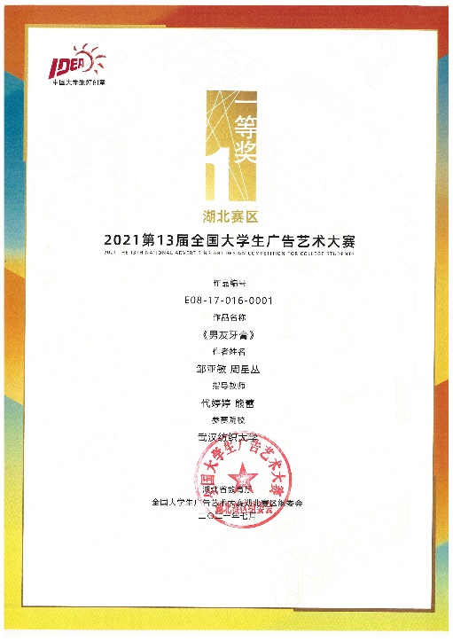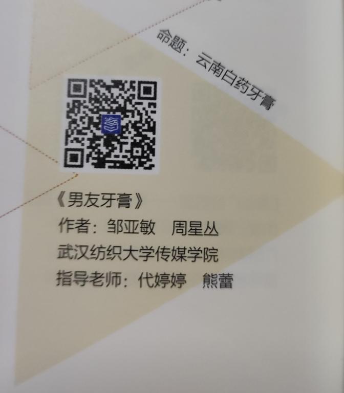 本次学科竞赛中,由304am永利集团代婷婷和熊蕾老师指导的广告11901的邹亚敏和网新11901的周星丛的作品《男友牙膏》荣获全国广播类二等奖、省级一等奖。