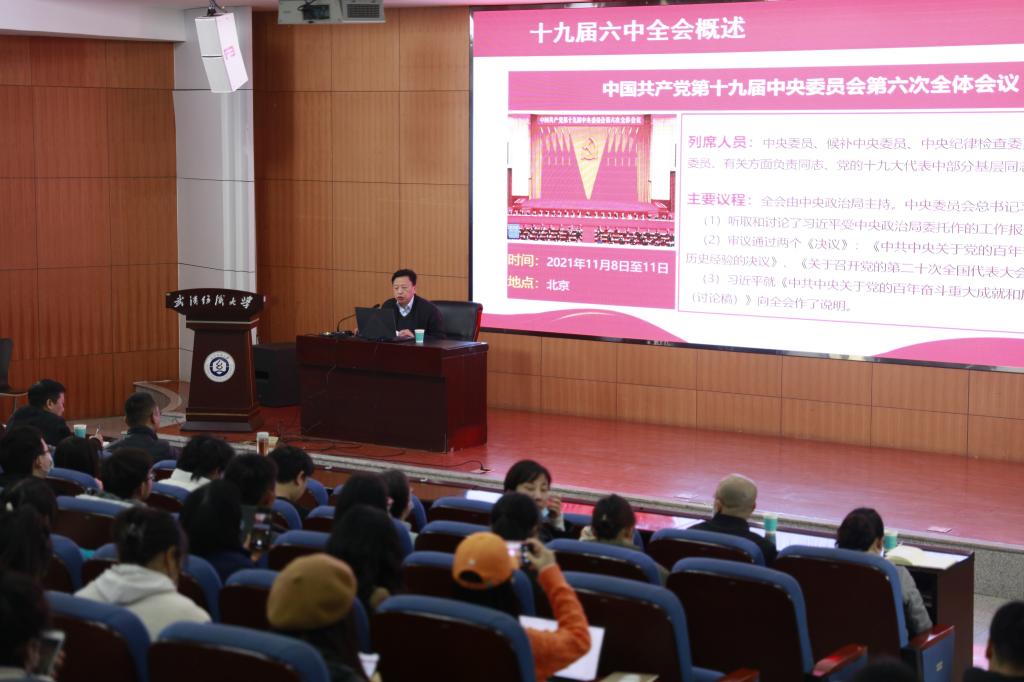 为学习宣传贯彻党的十九届六中全会精神,帮助广大师生党员深刻学习领会全会精神实质,12月9日,公司党委常委、纪委书记、监察专员程碧海在南湖校区尚美楼T201作党的十九届六中全会精神宣讲报告。304am永利集团、艺术公司、服装公司党员教师和部分员工党员参加了报告会。