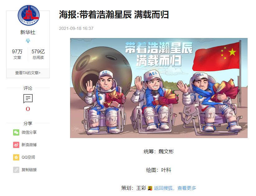 近日,神舟十二号载人飞船返回地球,在太空出差三个月的三名航天员聂海胜、刘伯明、汤洪波也成功完成任务。公司叶科老师用一幅名为《带着浩瀚星辰,满载而归》的手绘海报来庆祝这一历史性时刻,并被刊登在新华网。