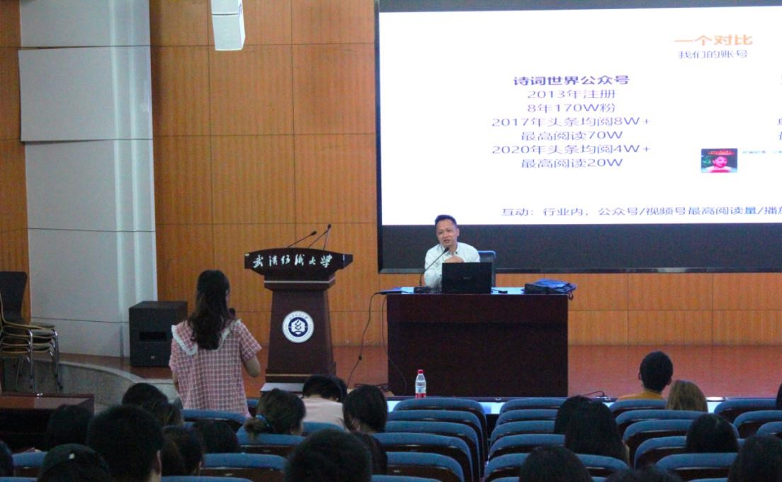 此后,魏贵芳先生从就业门槛,新媒体特点,变现方式与发展现状四方面分析了从事新媒体行业的原因,并着重讲解了新媒体未来发展的情况,表示虽然新媒体市场已趋于饱和,但自己仍然看好新媒体行业,鼓励老员工向新媒体行业发展。同时,魏先生以自身账号“诗词世界”的百万阅读量,“董卿读书会视频号”的千万播放量为例,向同学们展示现今新媒体行业的浏览量数据,从中体现新媒体行业市场广阔,机遇多样的特点。