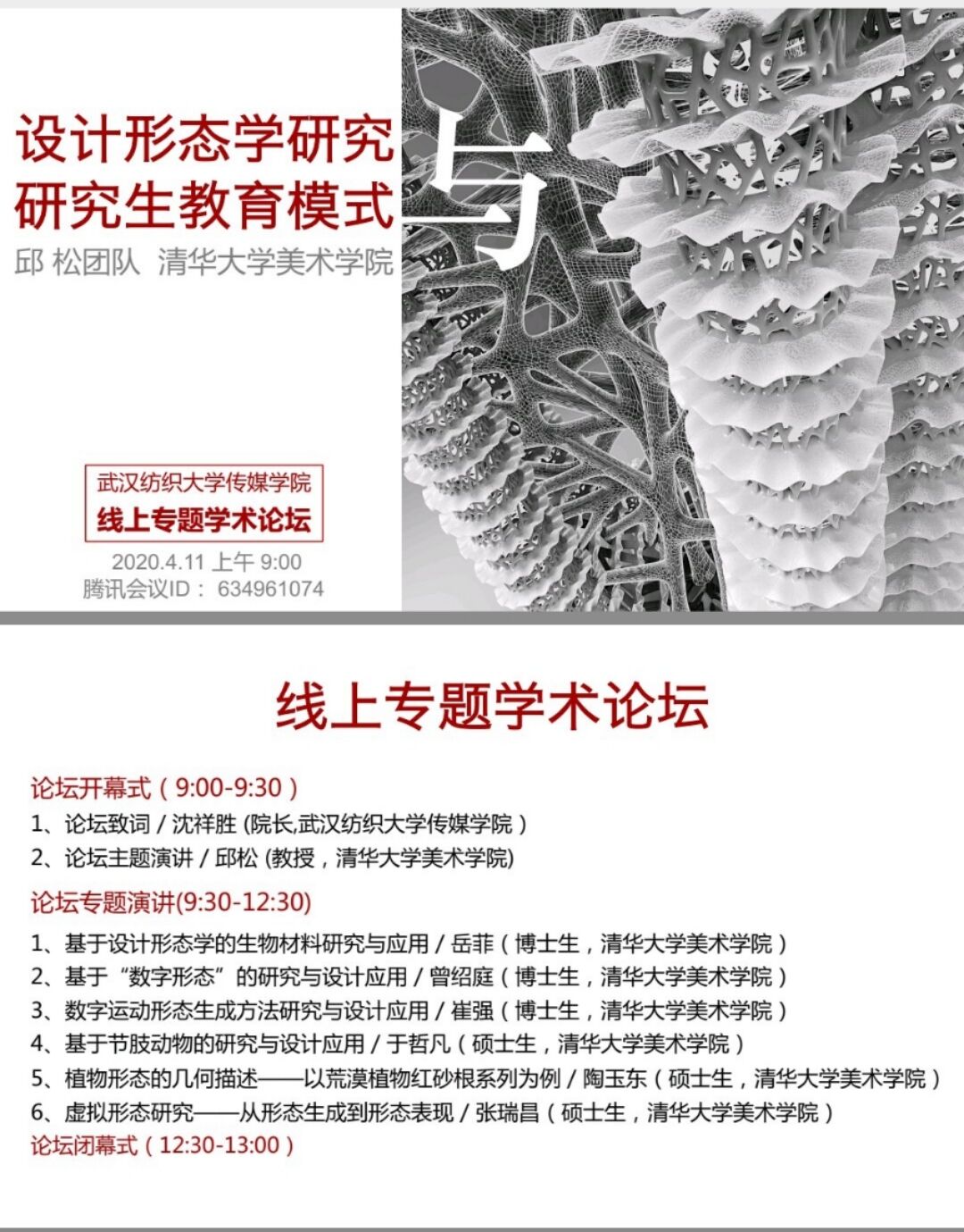 十一日上午,由公司举办的“设计形态学研究暨本、研究生教育模式”论坛在腾讯会议线上平台召开。来自清华大学美术公司的邱松教授团队,牛津大学、南安普顿大学、伦敦艺术公司、清华大学、中央美院、四川美院、西安美院、鲁迅美院、同济大学、北京服装公司、中国传媒大学、上海交通大学、江南大学等近八十所国内外高等院校的三百余名专家及304am永利集团相关专业师生参加了此次论坛。