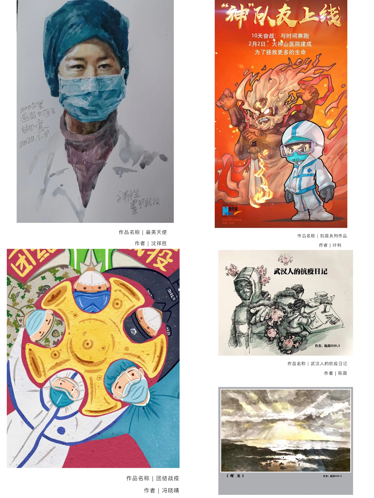 经理沈祥胜在看到一名女医生耗时四天三夜,骑行3000公里只为返回武汉抗疫一线,他用画笔记录下这位“最美的天使”;身为武汉人的叶科老师在看到武汉虽然物资短缺,但是所有的一线人员伟大无畏的逆行,国家大力援助和救援,火速建立了火神山和雷神山医院的时候,他拿起画笔记录下来武汉人战役的勇敢精神和战役阶段性成果一幕幕,给武汉加油!;陈苗老师画下了武汉的人的“抗疫日记”;数媒11701班冯晓晴看到医生、护士、警察、工人等等所有人都在为“抗疫”奋战在一线时,她用画笔画下了大家团结一致的样子……
