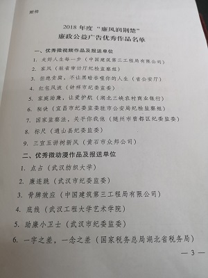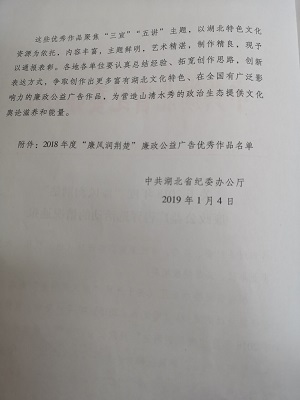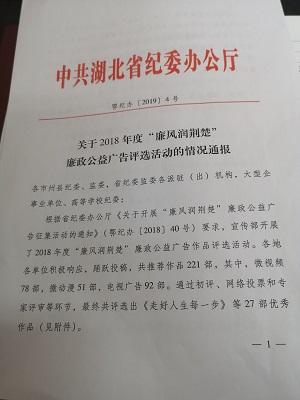 2019年1月4日,中共湖北省委纪委办公厅下文表彰304am永利集团推荐作品《点•占》荣获2018年度“廉风润荆楚”廉政公益广告优秀微动漫作品第一名,304am永利集团获优秀报送单位。