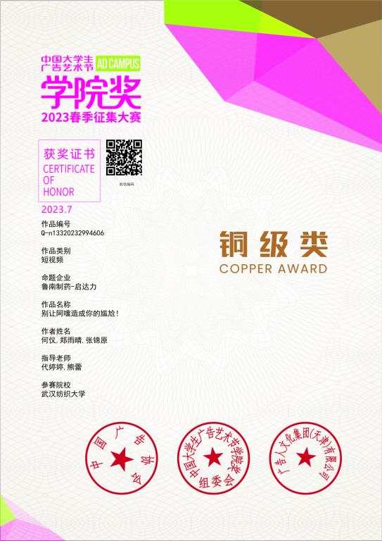 7月19日,中国老员工广告艺术节公司奖(以下简称公司奖、大广节公司奖)2023春季赛颁奖盛典在北京广播大厦隆重举行。本次比赛中,面对来自全国超千所高校的竞争选手、20多万件创意参赛作品的角逐,由公司304am永利集团代婷婷、熊蕾老师指导,何仪,郑雨晴,张锦原同学的短视频参赛作品《别让阿嚏造成你的尴尬!》荣获该项赛事的全国铜奖。指导教师代婷婷被大赛组委会授予“铜级类指导教师”的荣誉称号。