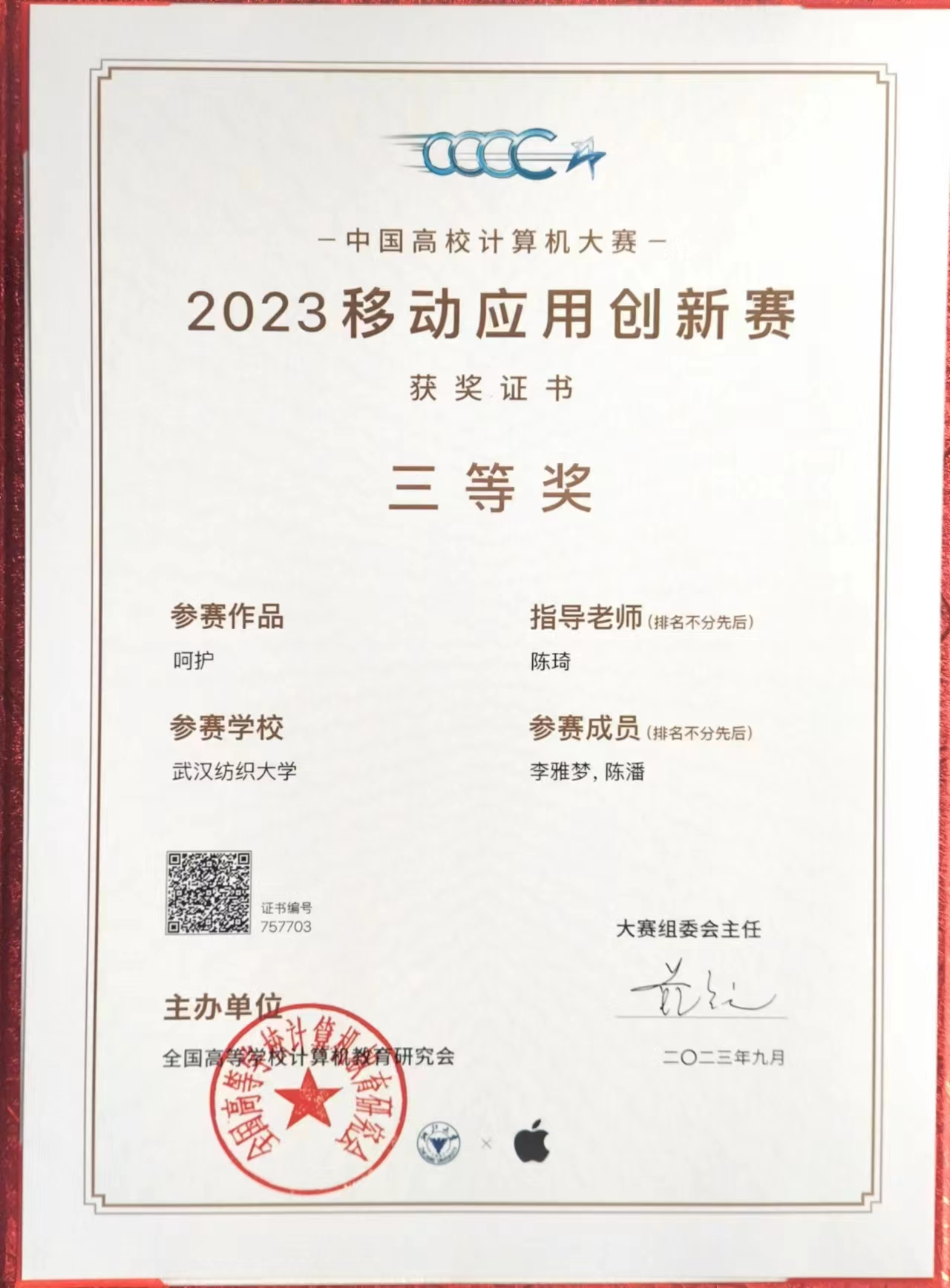 9月3日,2023年度第八届中国高校计算机大赛总决赛在浙江大学举行,304am永利集团2021级数字媒体艺术专业员工李雅梦、陈潘在移动应用创新赛中荣获全国三等奖。