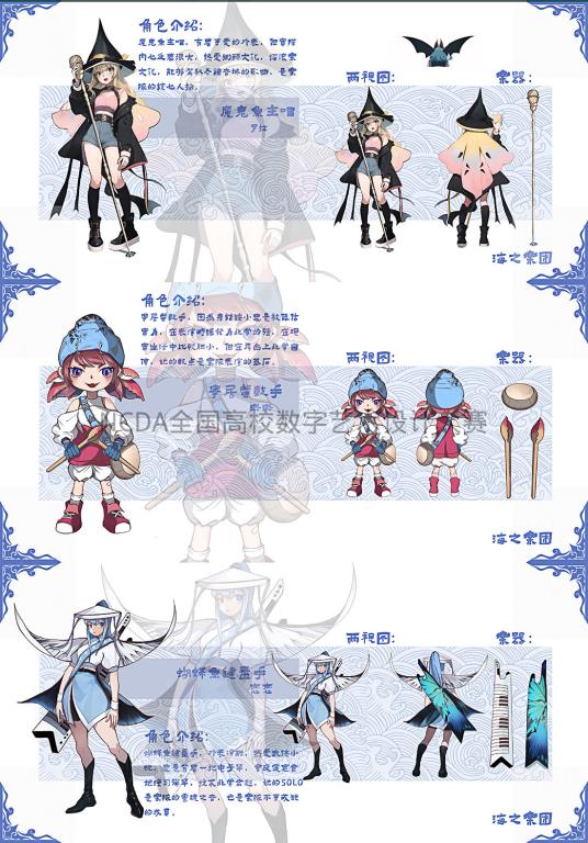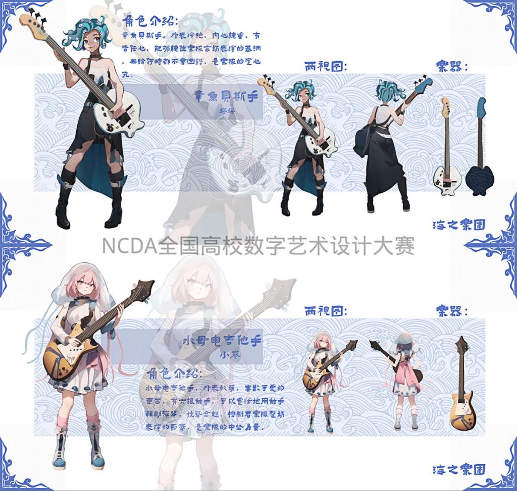 本次设计以海洋生物为参考,灵感来源于喜欢的乐队,设计概念为海之乐团,将不同的五个海洋生物进行了拟人化设计,每个角色都代表着不同的乐队分工,他们的服装造型与道具设计中都融入了海洋生物的元素,打造出了一个色彩缤纷、个性鲜明的乐队角色形象。