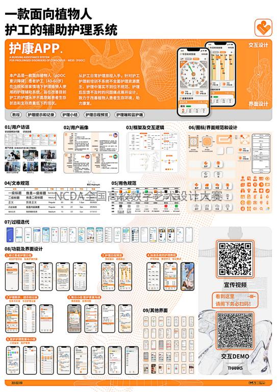 本产品是一款面向植物人(pDOC意识障碍)患者护工(40-60岁)在住院和居家情境下,护理植物人使用的护理辅助系统,旨在改善目前护工的护理水平不高导致患者生存状态和生存质量低下的现状。从护工日常护理旅程入手,针对护工护理前培训不系统不全面护理资源匮乏、护理中落实不到位不规范、护理后反馈不及时的问题痛点展开设存环境,助力康复。