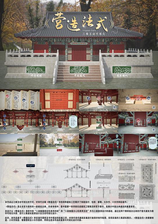 以三维互动可视化的方式,对宋代古籍《营造法式》中的四种建筑工艺展开了体验设计,包括:壕寨、大木作、小木作和彩画作。