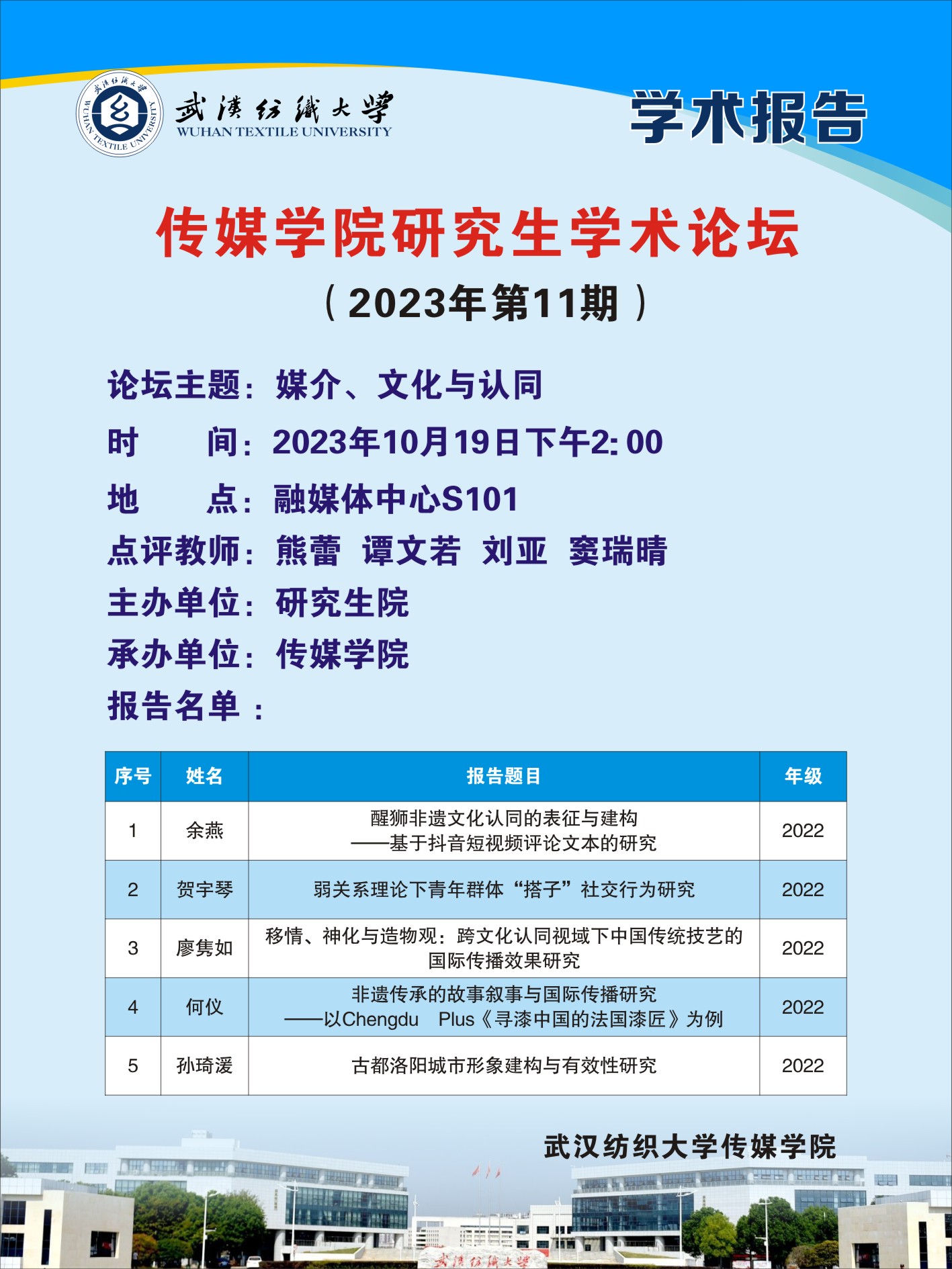 本次论坛的主题是“媒介、文化与认同”,余燕、贺宇琴、廖隽如、何仪、孙琦湲五位研究生围绕中华传统文化的媒介建构、国际传播与青年文化认同等问题依次进行汇报。老师们对员工的选题前沿性和理论可行性表示肯定,并从研究主体价值性、理论框架严谨性、学科领域聚焦性和后续研究方向等方面提出了宝贵的意见。