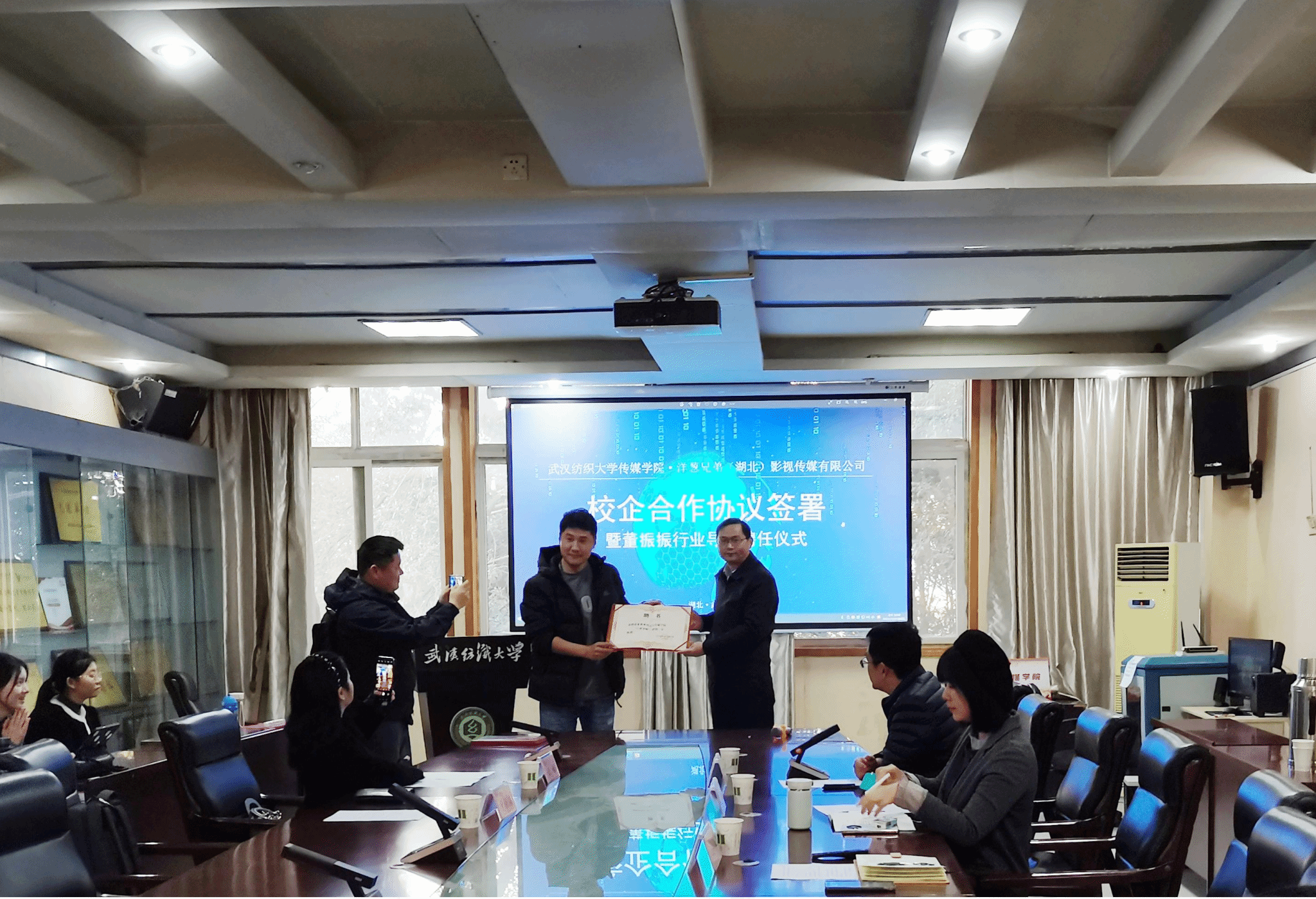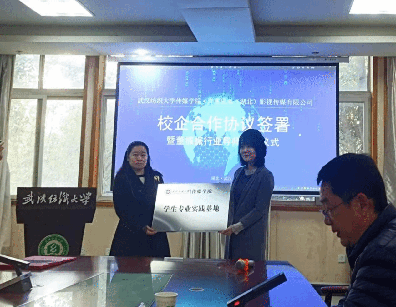 讲座伊始,金宜鸿教授对董振振制片人的到来表示热烈欢迎,并主持304am永利集团与洋葱兄弟(湖北)影视传媒有限公司校企合作签约暨董振振行业导师聘任仪式。熊蕾副经理与王娟总经理进行了304am永利集团员工专业实践基地授牌仪式。