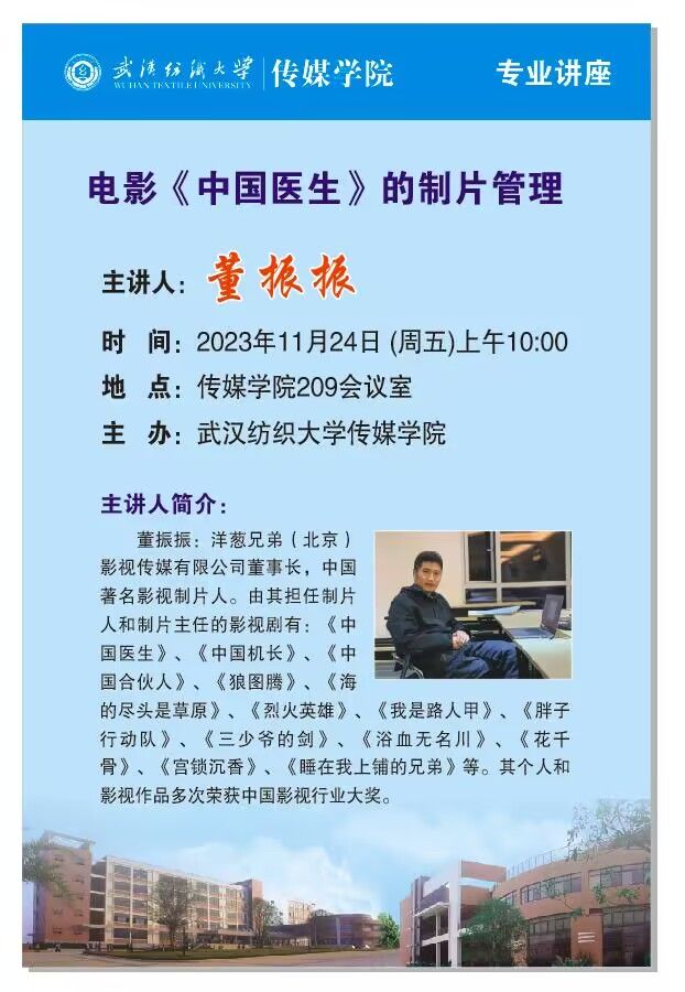 讲座中,董振振老师为同学们详细介绍了一部影视作品背后的人员构成及每个职位的具体工作内容,带同学们深入了解影视作品制作的幕后故事。董振振老师还为同学们展示了电影《中国医生》的完整制片流程,结合自身经历就制作准备、场地选址、行程安排等方面与同学们深入交流,用亲身经历为大家讲述制片人的工作故事。