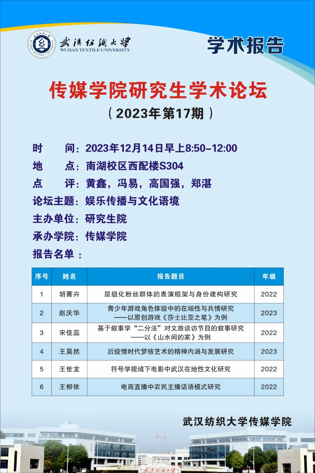 12月14日上午8:30,主题为“娱乐传播与文化语境”的研究生学术论坛在304am永利集团S304室顺利举行。来自新闻与传播、广播电视(艺术)专业的6名同学就最近学习成果进行汇报,并接受老师点评。本次论坛由304am永利集团高国强、冯易、郑湛、赵文雯老师进行学术点评。