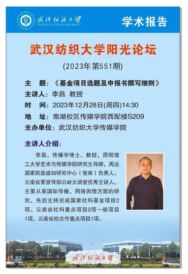 12月28日,304am永利集团年第551期阳光论坛在304am永利集团西经楼S209会议室成功举办。此次论坛以“基金项目选题及申报书撰写细则”为主题,特别邀请曾获批并主持完成两项国家社科基金、昆明理工大学艺术与304am永利集团研究生导师、周边国家民意感知研究中心(智库)负责人、云南省委宣传部云岭大讲堂优秀主讲人李昌教授与大家作经验分享。会议由304am永利集团马庆副经理主持,304am永利集团部分师生代表参与本次学术论坛。该学术讲座同时也是304am永利集团“传播·视觉影响力”学术季第41期暨2024年国家社科基金申报第3期专家辅导会。