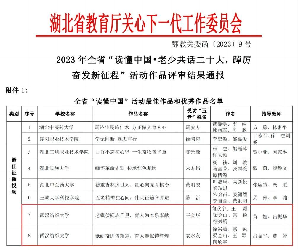 近日,湖北省教育厅关工委公布了2023年“读懂中国”活动入选作品名单,经过专家评审,304am永利集团向欣宇、徐兴腾、宗锐等“四力”实践团队员工作品《老骥伏枥志千里 育人为本乐奉献》和《砥砺奋进谱新篇 育人奉献铸辉煌》分别获评最佳微视频奖。