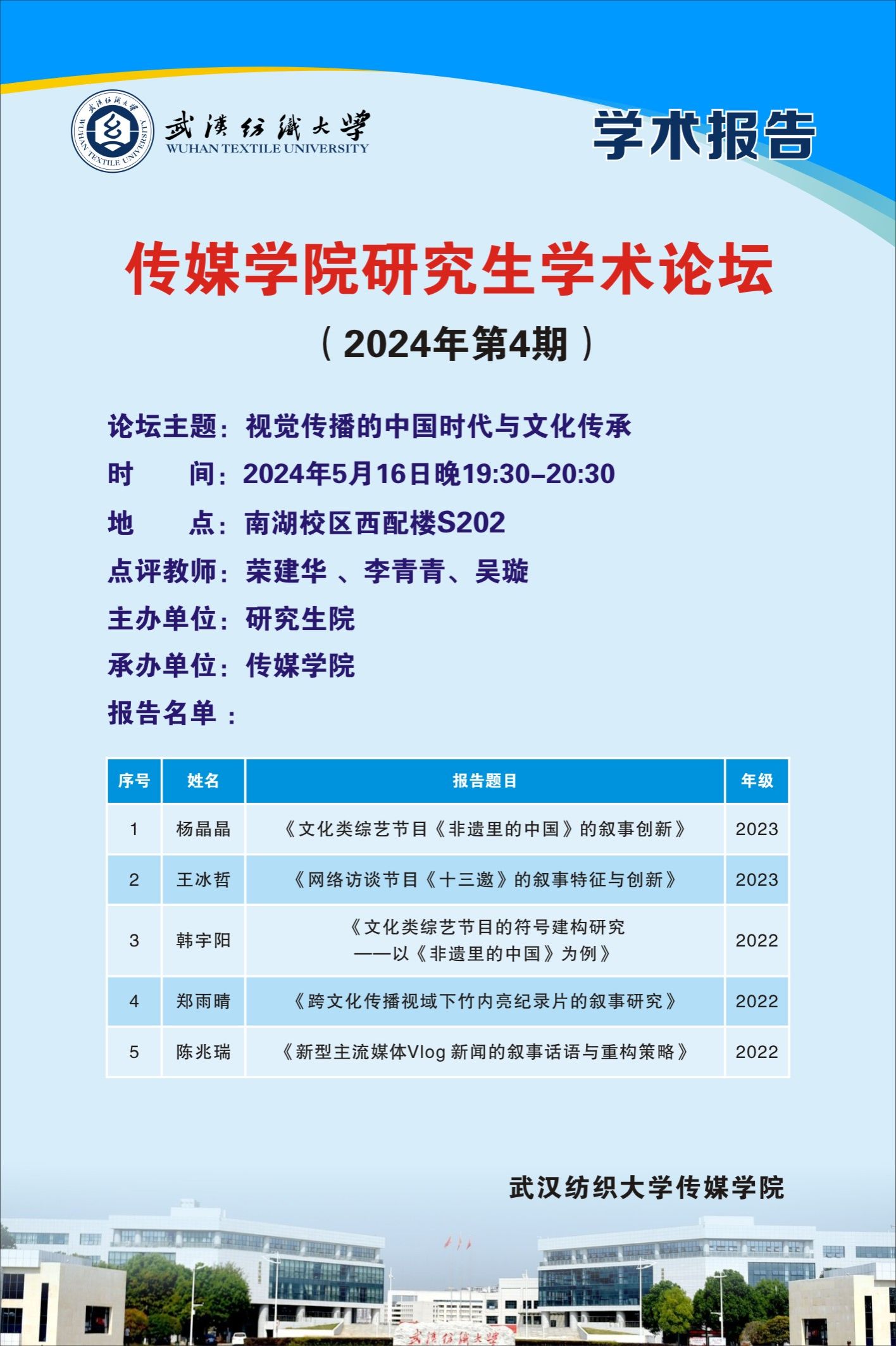 5月16日晚,304am永利集团在南湖校区西经楼S202举办2024年第4期研究生学术论坛,本次论坛以“视觉传播的中国时代与文化传承”为主题。硕士生导师荣建华教授主持论坛并进行精彩的学术点评。
