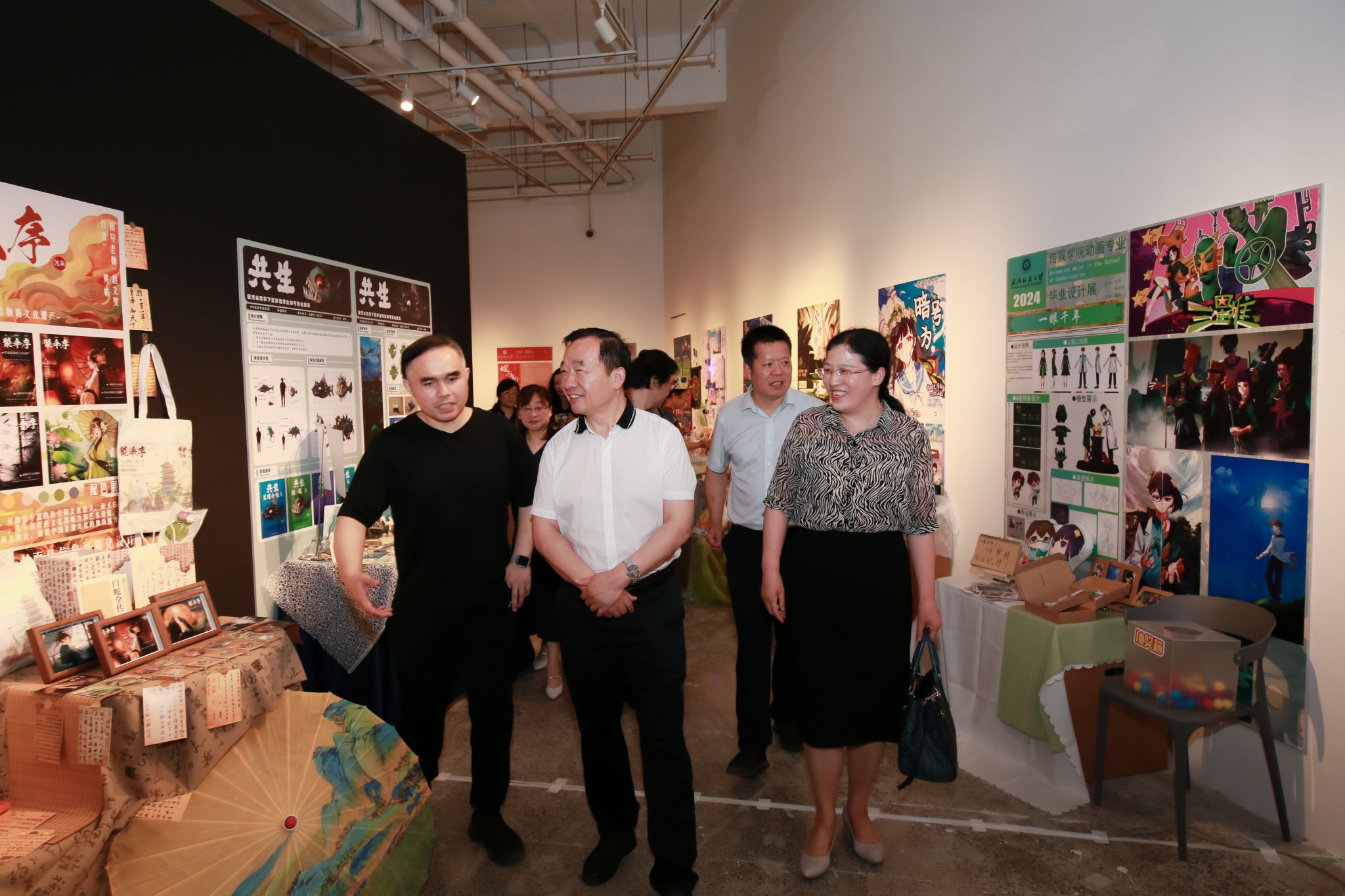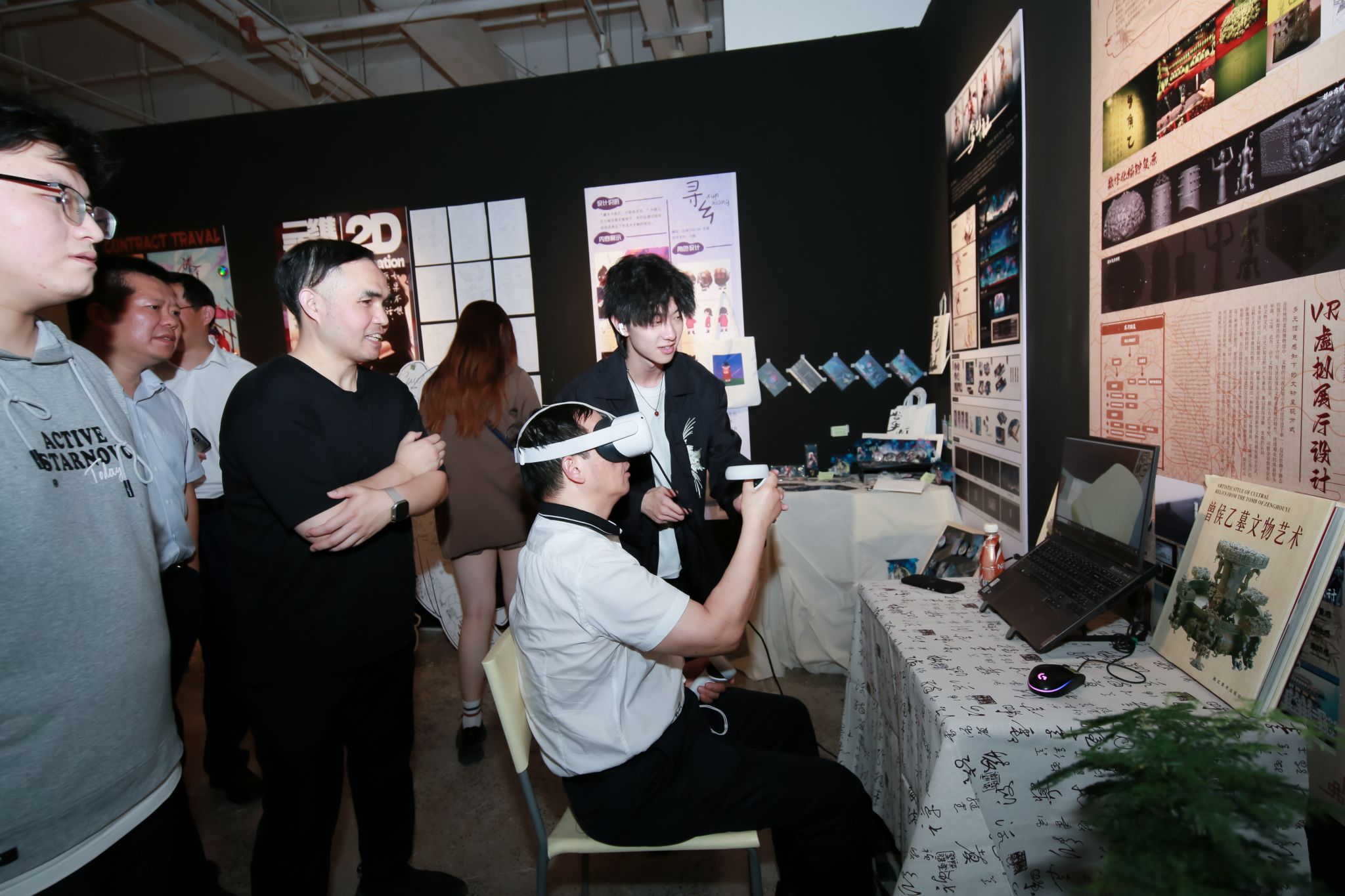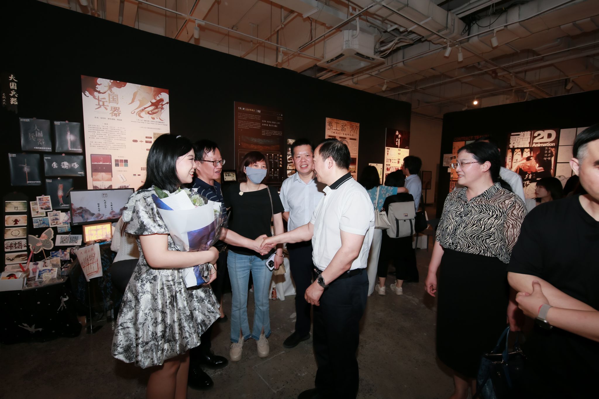 开幕式后,与会领导、嘉宾和师生现场参观了毕业设计展。黄国辅副书记与参展员工家长交流,并体验员工设计的沉浸交互式作品。