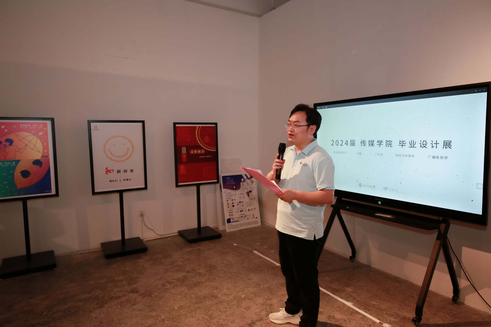传媒公司党委书记曾令玉为此次毕业展作品“最佳人气奖”毕业生颁奖。获奖毕业生代表、数媒12002班的刘欣怡发表感言,她感恩母校、感恩师长、感恩朋友,表示将牢记“崇真尚美”校训和“自强不息、经天纬地”的纺大精神,肩负起新时代的重任,不负时代,不负韶华。