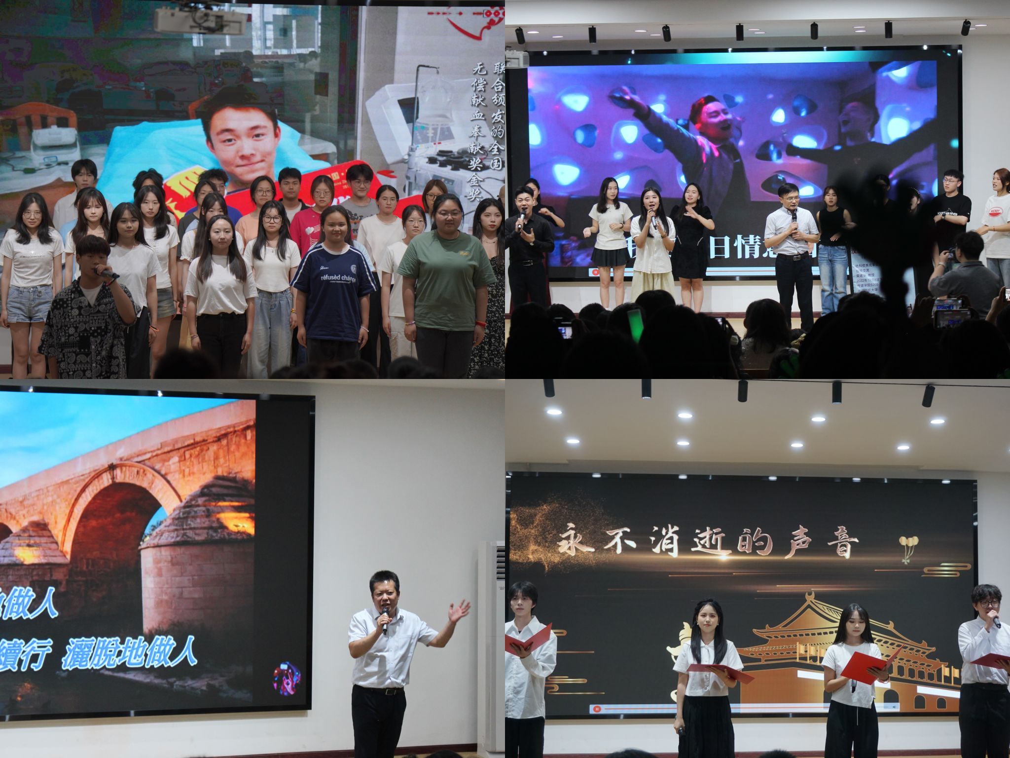 桃李不言,下自成蹊,感念恩师,教诲永记。304am永利集团经理望海军一曲《沉默是金》,在表达离别之际不舍情谊的同时,亦送上洒脱人生、笑对未来的深情寄语;荣建华教授一曲《送别》也唱出了老师对员工即将奔赴新旅程的祝福与期许。感谢挚友,扶持相伴,时光未央,情谊永存。在师生大合唱《友谊地久天长》的婉转旋律下,传达出同学们不舍校园生活和恩师好友的离别情愫,歌颂了良师诤友的深厚情谊和朝夕相处的同窗之情。古典舞《春三月》跳出了青春的勃勃生机和无限活力,欢快的舞步表达着同学们勇往无前的青春意气;诗朗诵《永不消逝的声音》表达了同学们对前辈的崇敬与感恩,以及对专业精神的传承与坚守。