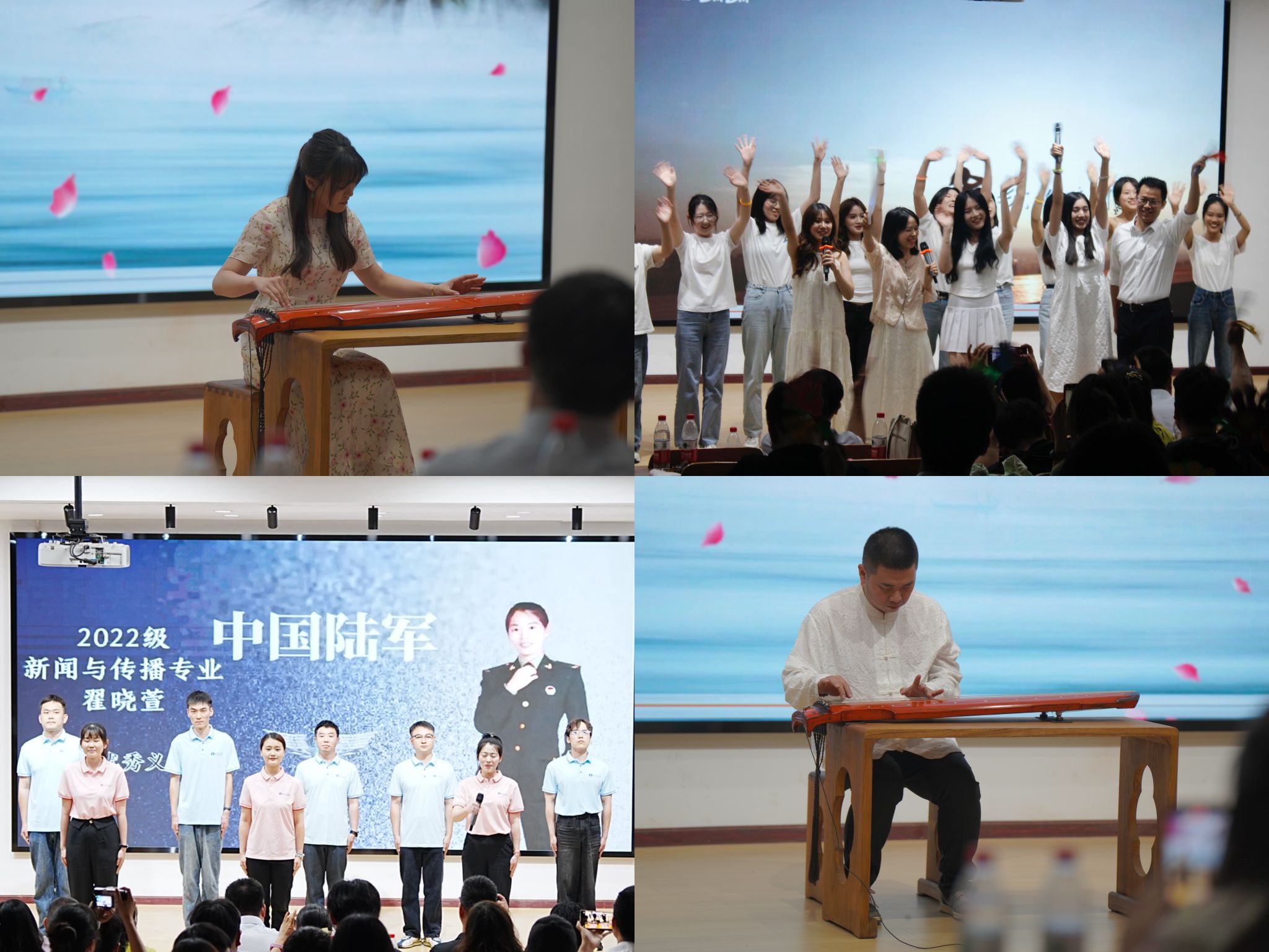 筑梦未来,再启新程,心怀梦想,展翅翱翔。联欢会上,望海军勉励毕业生们:要秉持初心,不忘来路,书写青春新一页;要笃行不怠,行稳致远,迈出人生新一步;要心怀期冀,乐于奉献,谱写青春新乐章。退役老员工士兵们以一曲《当这一天来临》展现了年轻一代的昂扬风貌和飒爽英姿,表达了矢志奉献的报国志向和挺膺担当的奉献精神。青年教师窦瑞晴以古琴独奏《明月几时有》弹出了对毕业生们的惜别之情与美好祝愿;受现场热烈氛围感染,王佳琦即兴演奏一曲《高山流水》,抒发了知音难觅、珍重情谊;山高水长,友谊长存的无限思绪。晚会最后,全场师生共同唱响歌曲《再见》,将整场活动推向高潮,离别不说再见,青春不说再见,奋斗者正青春,在悠长美好的曲调中,活动落下帷幕。