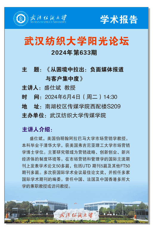 6月4日,304am永利集团第633期阳光论坛在西经楼S209会议室如期举行。美国阿拉巴马大学市场营销学教授,曾任中国、法国及香港等国家和地区多所大学的兼职教授、访问教授盛仕斌以“从困境中拉出:负面媒体报道与客户集中度”为题进行学术分享。会议由304am永利集团经理望海军主持,304am永利集团教师代表、员工代表参会。