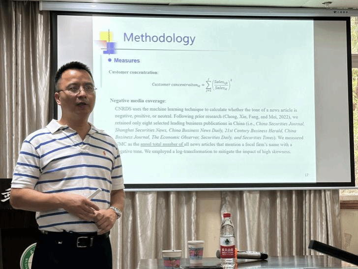 会上,盛仕斌教授一是聚焦企业的负面媒体报道对客户集中度的影响,以主流媒体报道语调、企业主要客户披露、企业创新绩效等多个维度,通过量化研究对研究假设进行论证;二是媒体报道与企业绿色创新绩效的关系,通过分析媒体视角的语调、企业视角的语调,来探索媒体报道对企业创新的影响机制。