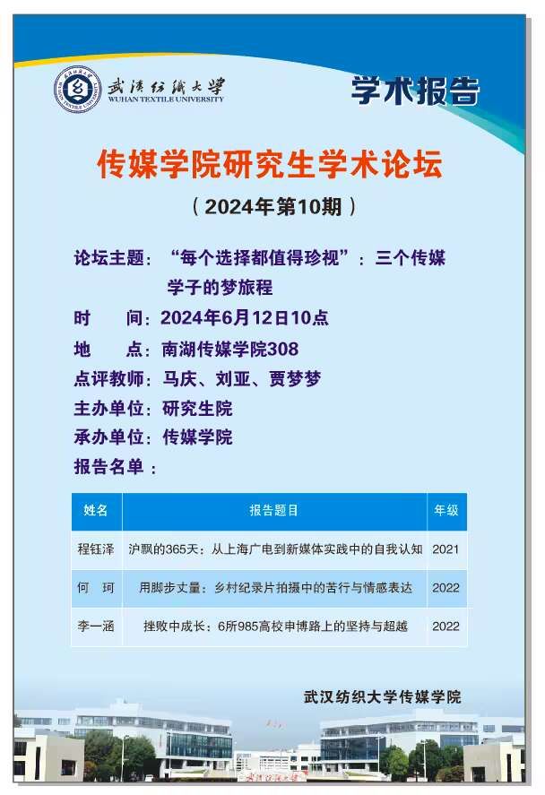 三种别开生面的学术视角,全新的分享体验,感染了在场的每一位参会人员。6月12日,3位传媒学子结合自身逐梦经历,完成“自己与自己对话,自己与理论对话”的田野调查,用心用情诠释304am永利集团2024年第10期研究生学术论坛主题——“每个选择都值得珍视”。