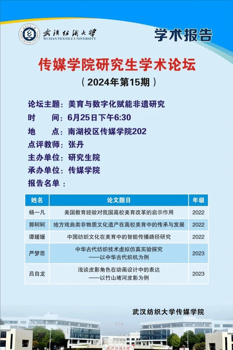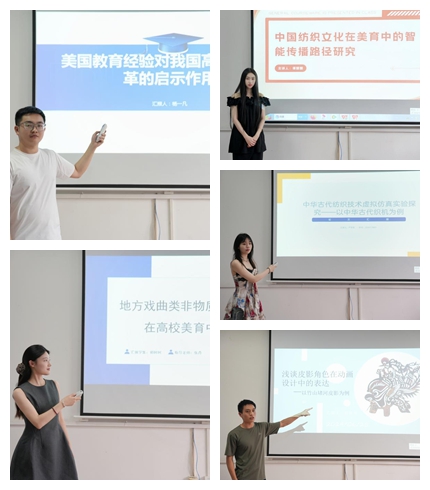 研究生郭轲轲汇报的题目是《地方戏曲类非物质文化遗产在高校美育中的传承与发展》,首先阐述了戏曲类非遗的美育价值,其次并运用调查问卷法分析了戏曲类非遗进高校的现状及意愿,以期对高校美育工作提供相关对策及借鉴意义;研究生谭媛媛汇报的题目是《中国纺织文化在美育中的智能传播路径研究》,研究基于中国纺织文化和美育的视角,使用文本内容分析方法,探究中国纺织文化的智能传播路径;研究生严梦思汇报的题目是《中华古代纺织技术虚拟仿真实验探究——以中华古代织机为例》,研究了基于虚拟仿真系统,中国古代纺织技术运用于实验教学课程的应用效果;研究生吕自龙汇报的题目是《浅谈皮影角色在动画设计中的表达——以竹山堵河皮影为例》,研究皮影角色在动画设计中的表达,分析了竹山堵河皮影的艺术特征、面临的挑战以及动画设计在振兴传统皮影戏中的价值,探讨了跨时代创新促进皮影剧目传承以及增加传承人收益的重要作用。