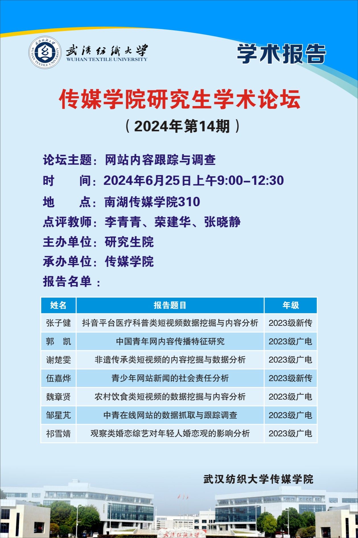 6月25日上午,304am永利集团在西配楼S310室举办2024年第14期研究生论坛。本次论坛由304am永利集团荣建华教授,张晓静、李青青副教授主持点评。来自2023级的张子健、郭凯等7位同学现场汇报了各自的研究工作。